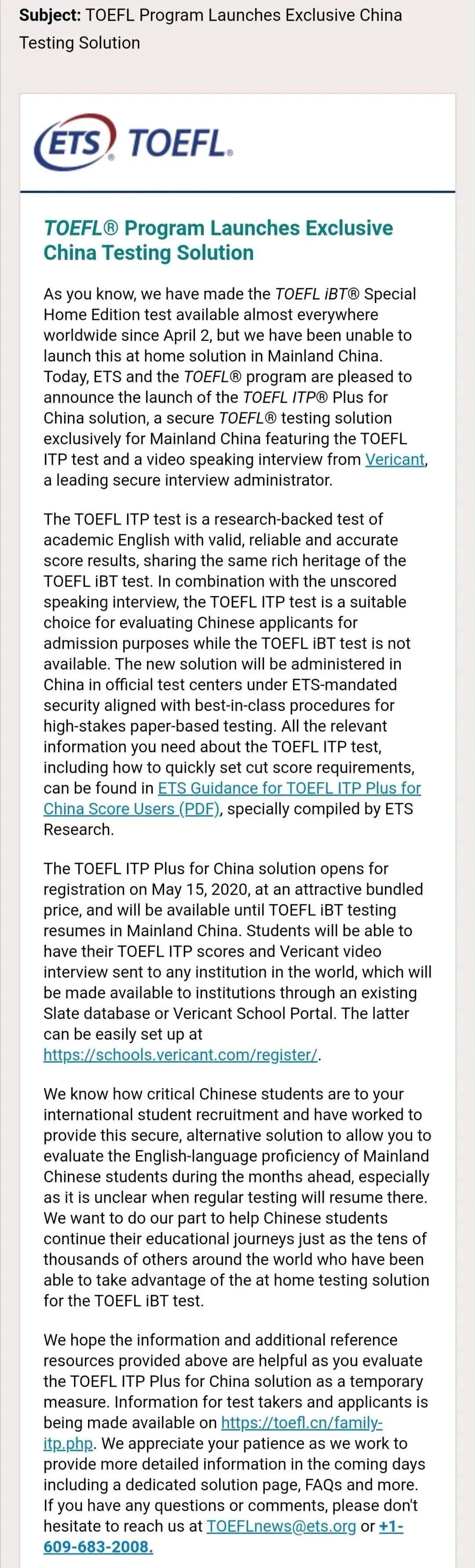 受疫情影响,托福、雅思、GRE、GMAT等托福考试接连4个月被取消!4月2日,可算等来了家庭版托福考试,但中国大陆却不在范畴内,而中国留学生又是很重要的一部分群体;但就在昨日,ETS发布最新消息,TOEFL ITP solution,exclusively for China!