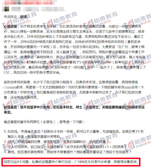 回答完这4个问题,如果你还需要中介帮忙的话,广州地区尤其是PhD申请,我推荐哈鲁留学。