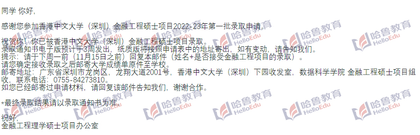 【哈鲁2022录取】香港中文大学深圳校区金融工程硕士录取来啦!