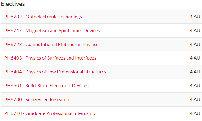 课程由 32 个学术单位 (AU) 组成,其中包含20 AU必修课以及12 AU选修课。