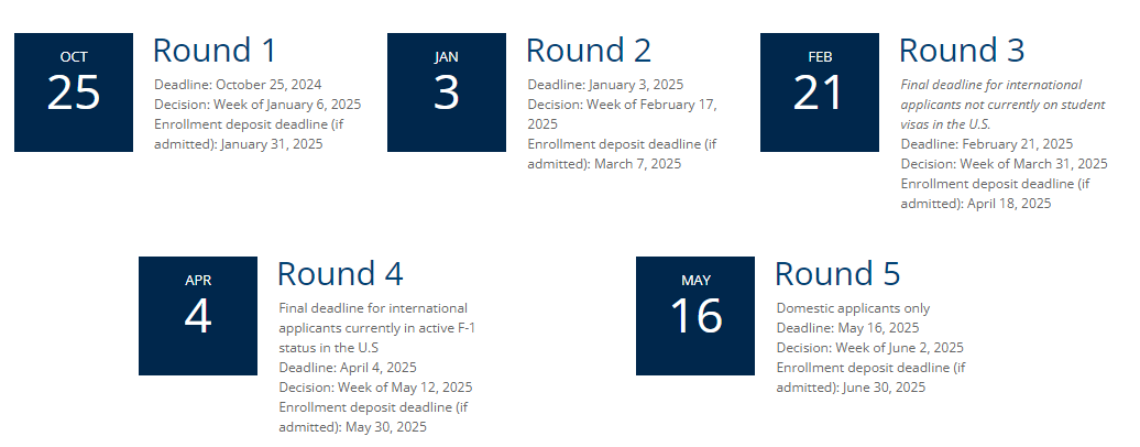 同学们注意啦!近日,备受关注的密歇根大学安娜堡分校Ross商学院也官宣开放2025年秋入学申请,该学院共设有四项热门的一年制硕士项目,分别是会计学硕士、商业分析硕士、管理学硕士和供应链管理硕士!四大项目申请时间一致,且第一轮截止时间均为10月25日,具体轮次截止时间分别如下: