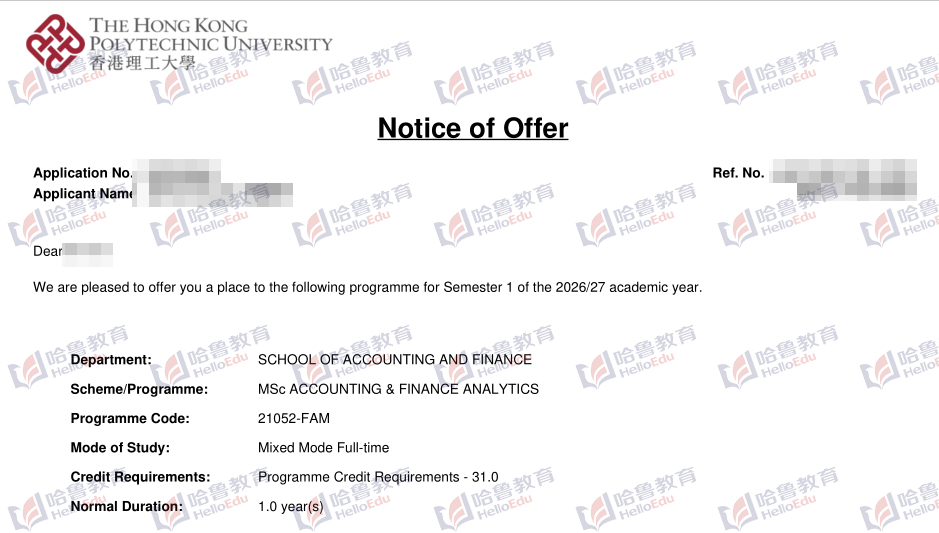 【哈鲁2026录取】香港理工大学会计与金融分析硕士offer到!