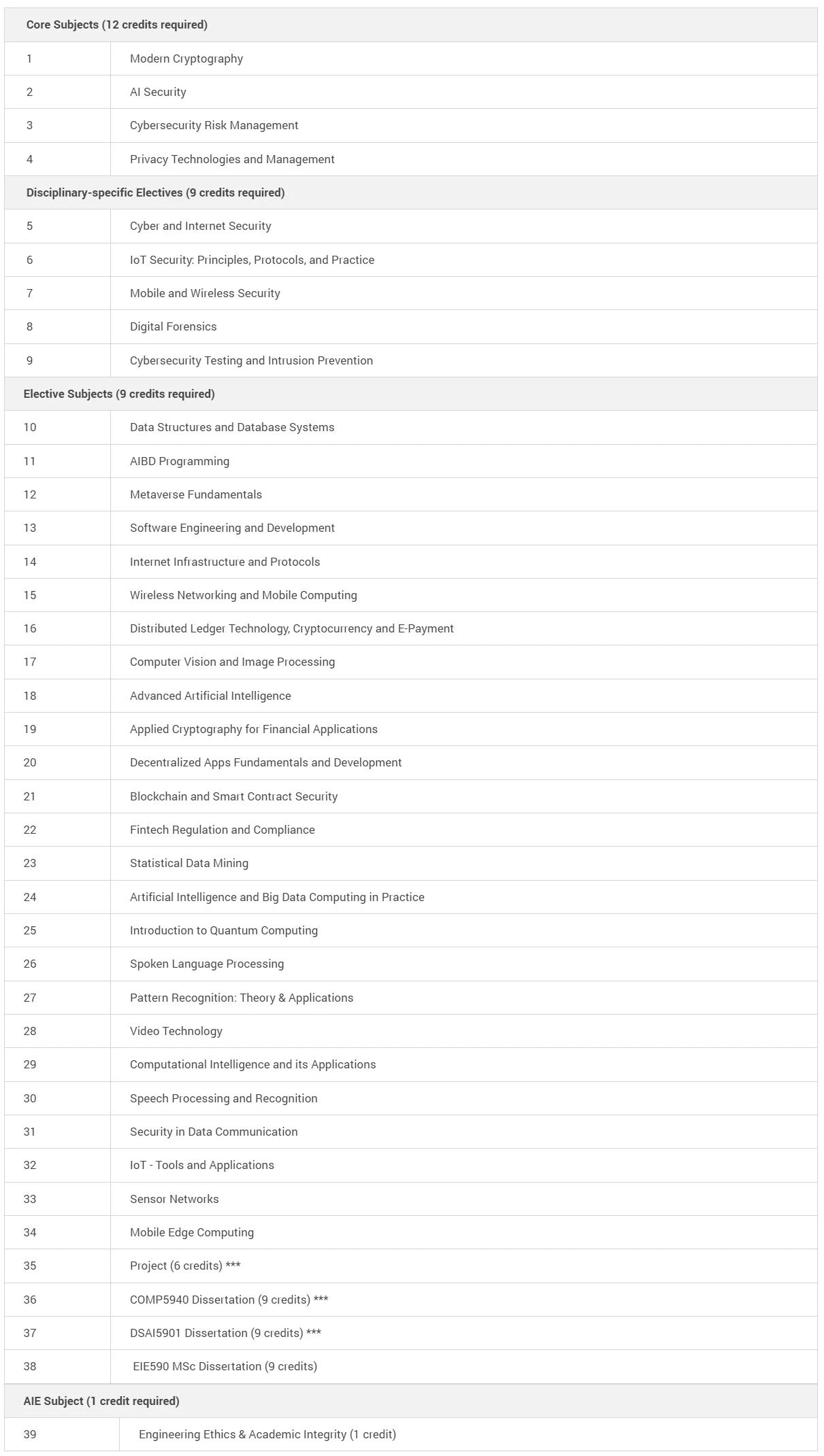 二、网络空间安全硕士-Master of Science in Cybersecurity 1、项目基本信息: 开设院系:Faculty of Computer and Mathematical Sciences-Department of Computing 学制时长:全日制1年 入学时间:2026年9月 授课语言:英语 学费:HK$426,000