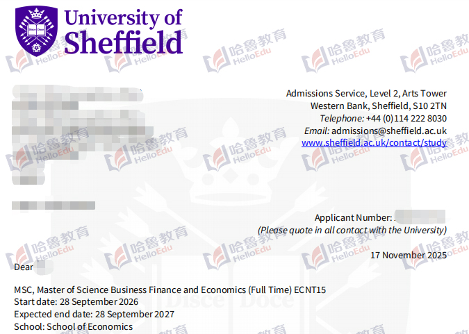 【哈鲁2026录取】谢菲尔德大学商业金融与经济学硕士offer到!