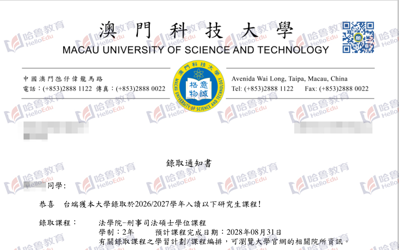 【哈鲁2026录取】GPA2.7+获澳门科技大学刑事司法学硕士offer!