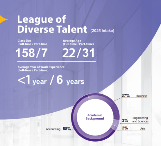 从2025/26学年录取结果来看,70%为商科背景:商业/经济(37.9%)、金融(20.9%)、会计(11.8%)。
