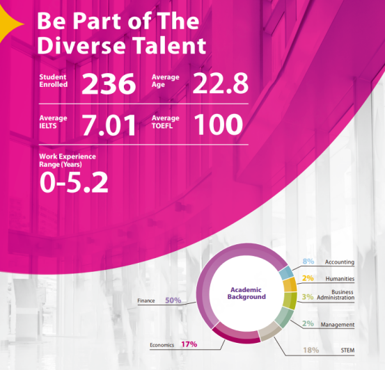 录取最多的是金融背景,达到了50%;经济学背景17%。STEM领域的申请人占比提升到18%,上一届为9%,人文背景录取学员比率从7%降到2%。