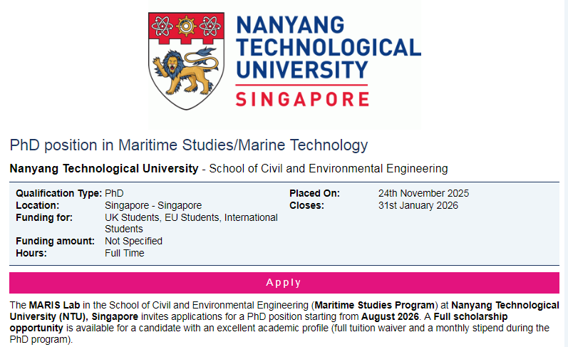全奖博士!南洋理工大学海事研究博士项目正在招生!