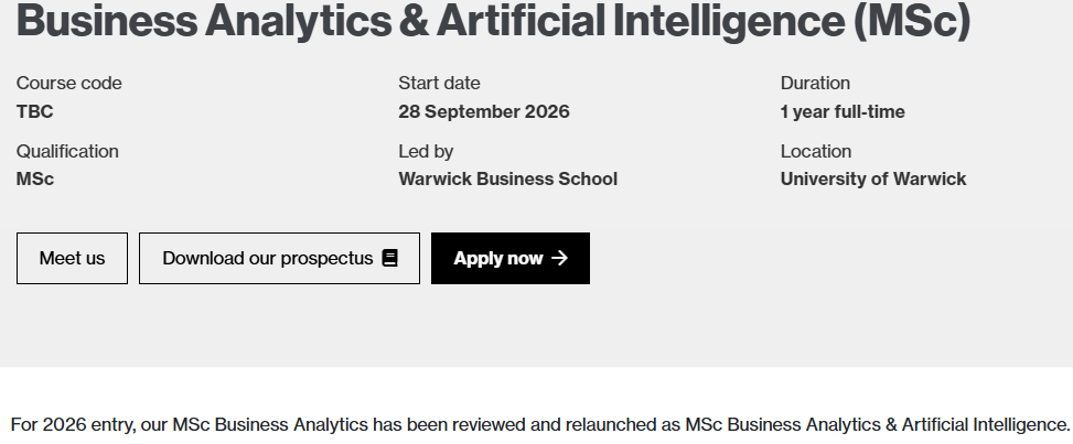 华威大学26fall新增商业分析与人工智能硕士!