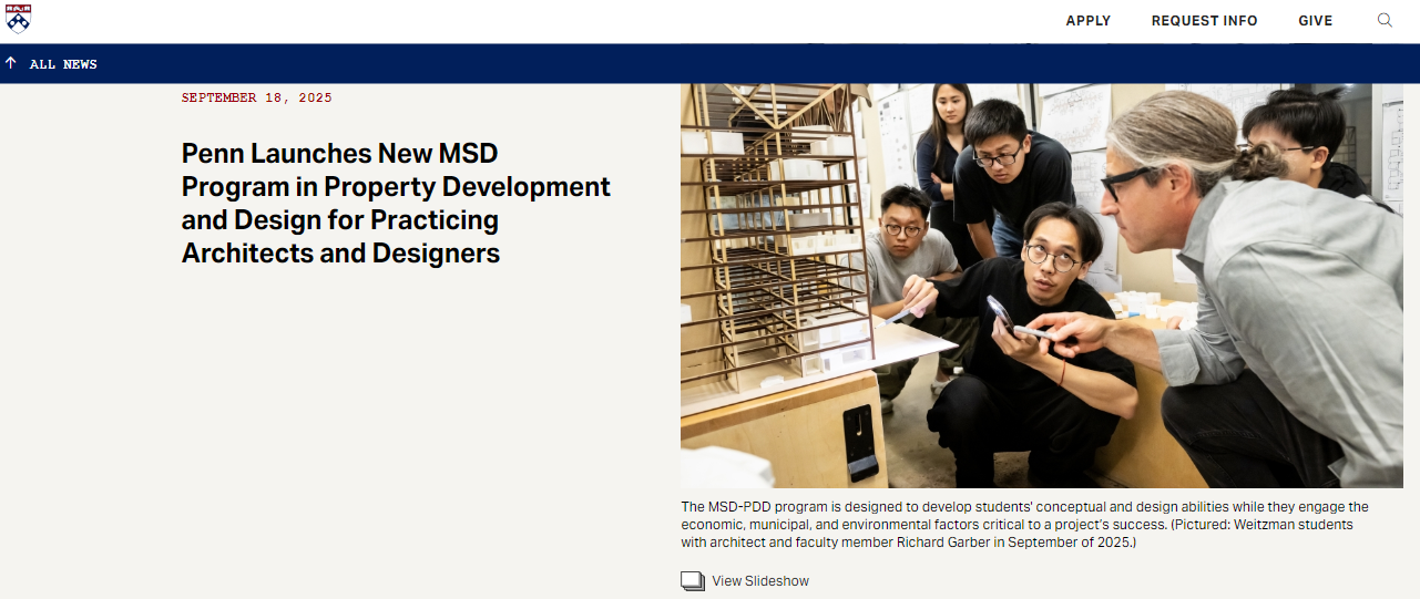 同学们请注意!近日,美国老牌藤校宾夕法尼亚大学魏茨曼设计学院官宣增设一门全新的一年制STEM课程——房地产开发与设计硕士(Master of Science in Design: Property Development and Design)!2026年为首届入学,且目前已开放申请,截止日期为1月7日!感兴趣的同学,赶紧冲啊~