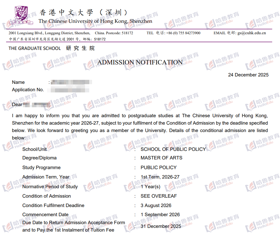 【哈鲁2026录取】转专业GPA3.4+获港中深公共政策硕士offer!