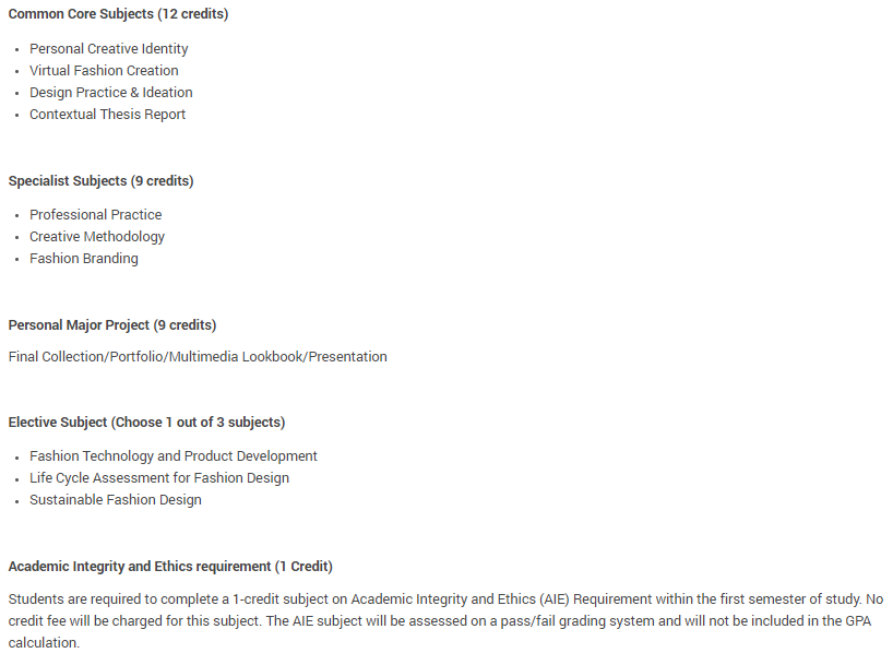 一、时装设计文学硕士-时装实践Master of Arts in Fashion Design: Fashion Practice (FP) 1、项目简介: 这个专业强调设计在快速发展的时尚产业中的作用。学生将探索他们的价值观和个人表达方式,发展独特的设计实践,在更广泛的社会文化背景下考虑当代时尚。时尚实践路径支持学生建立一个坚定的理解如何商业化的创造力,同时响应市场和社会的需求。该课程让学生接触到最新的专业和可持续的实践,使学生具备必要的技能,成为负责任的、为行业做好准备的专业人士,他们有潜力积极影响时装业的未来。