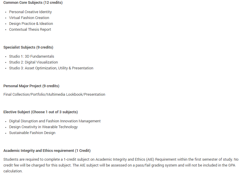 二、时装设计文学硕士-数码时装及创新Master of Arts in Fashion Design: Digital Fashion Innovation (DFI) 1、项目简介: 这种独特的专业化是对时尚行业数字化转型的回应,Web.3.0和元宇宙的兴起为重新想象时尚的起源和体验提供了巨大的机会。数字时尚创新途径将时尚的范围扩展到了传统设计之外。学生将把创造力与新兴技术相结合,并获得与行业相关的工具的实践经验,以探索数字时尚的潜力——从3D设计、数字原型、数字资产和NFT到身临其境的数字环境和时尚展示。该课程确保学生具备必要的技能,在虚拟和混合时尚生态系统中茁壮成长,并在新的数字时代掌舵。