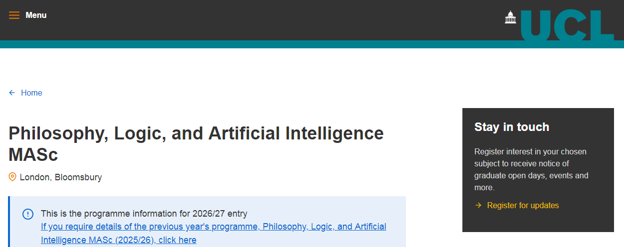 人工智能(Artificial Intelligence,简称AI)领域作为近些年来最热门的留学申请方向之一,各大高校纷纷推出相关硕士专业以供广大学子选择!伦敦大学学院(UCL)作为英国“G5”大学之一,在26fall申请季中也推出了相关专业——哲学、逻辑与人工智能硕士(Philosophy, Logic, and Artificial Intelligence MASc)!目前,该项目已开放申请。下面,我们一起来简单了解该项目的一些信息~