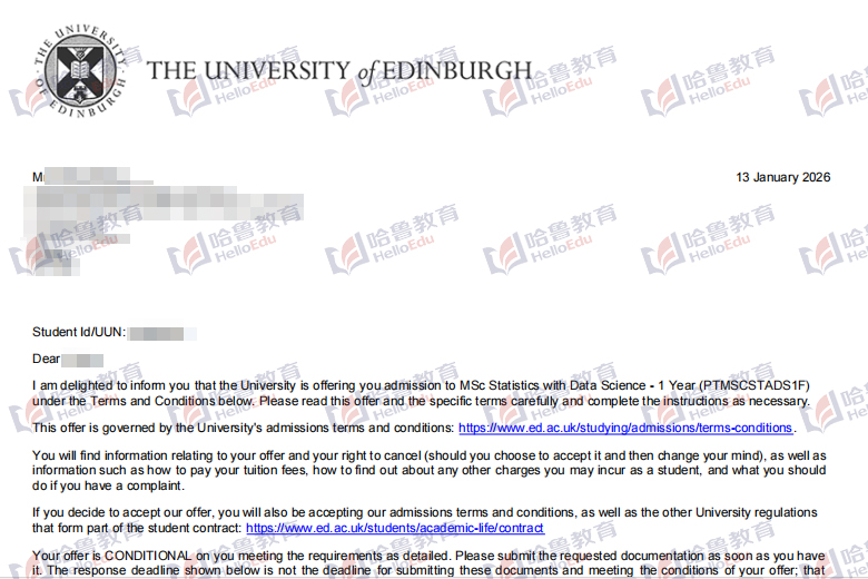 【哈鲁2026录取】爱丁堡大学统计学与数据科学硕士offer到!