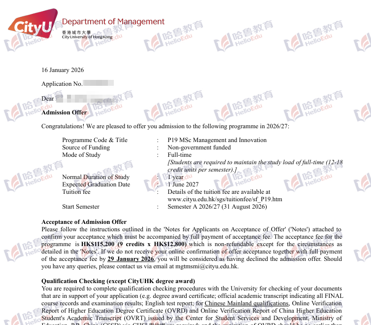 【哈鲁2026录取】双非、GPA80+获香港城市大学管理与创新硕士offer!