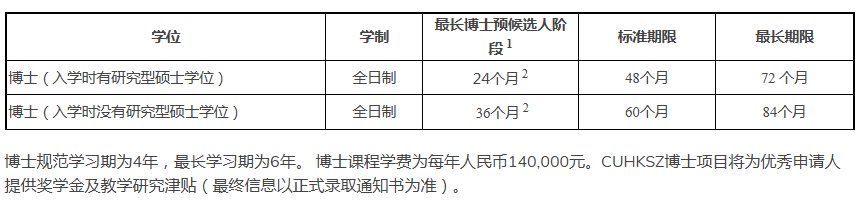 博士规范学习期为4年,最长学习期为6年。 博士课程学费为每年人民币140,000元。CUHKSZ博士项目将为优秀申请人提供奖学金及教学研究津贴(最终信息以正式录取通知书为准)。