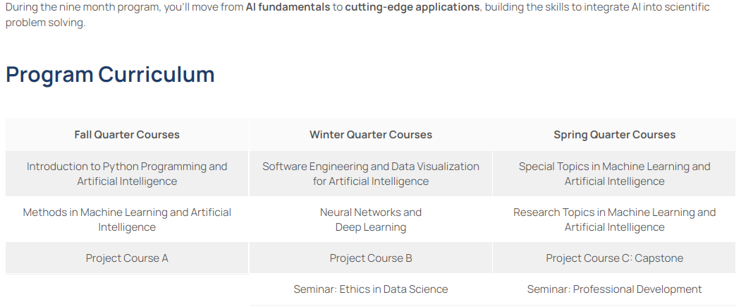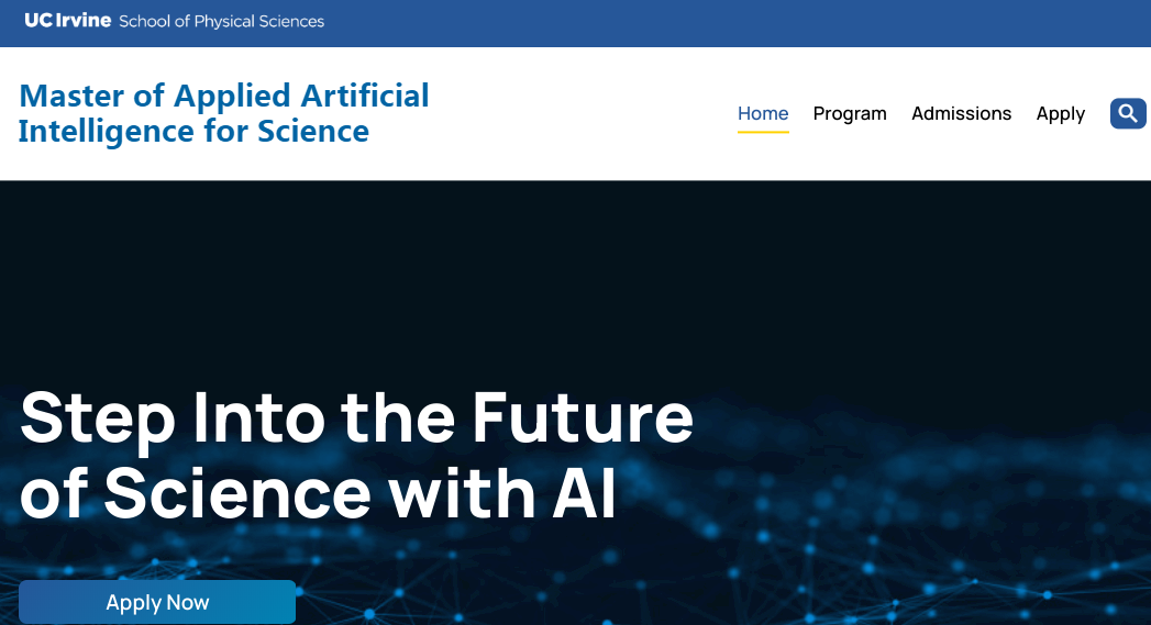 同学们注意了!加州大学欧文分校官宣在2026秋增设火热AI类专业——科学应用人工智能硕士(Master of Applied Artificial Intelligence for Science)!目前,该项目已开放26fall申请,且截止日期为3月15日!感兴趣的同学,赶紧冲啊~ 一、项目基本信息: 项目名称:Master of Applied Artificial Intelligence for Science 开设院系:School of Physical Sciences 学制时长:全日制9个月 入学时间:2026年秋 学费:$39,000 国际生申请截止日期:2026年3月15日