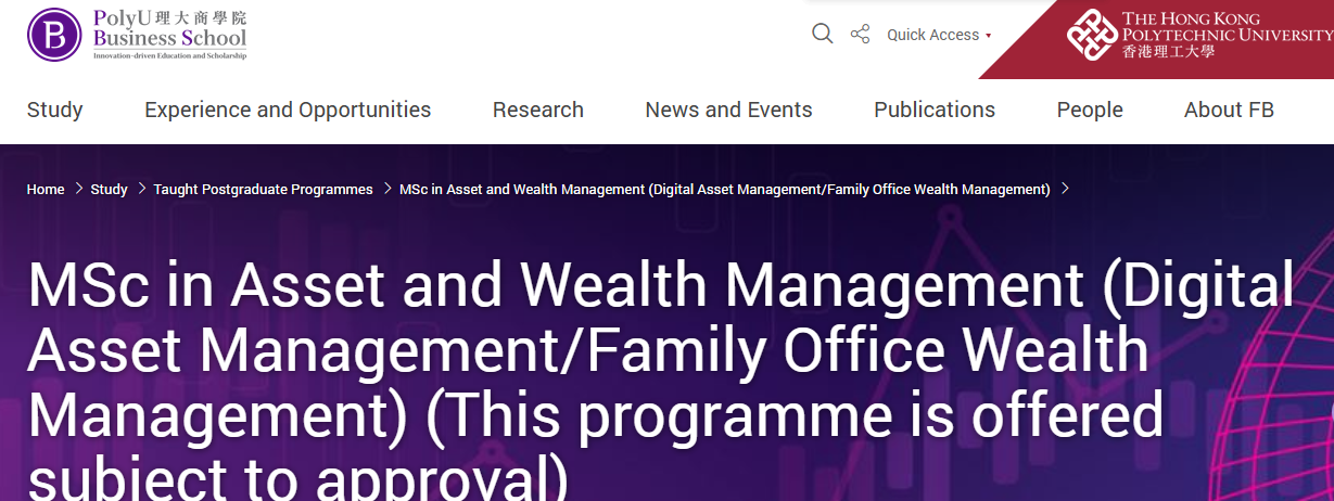 同学们请注意!近日,香港理工大学商学院悄悄更新了一个宝藏专业——资产与财富管理硕士(MSc in Asset and Wealth Management),并设有两个专业方向:数字资产管理&家族办公室财富管理!目前,该新专业已开放26fall申请,且截止日期为4月30日!下面,我们一起来看看~