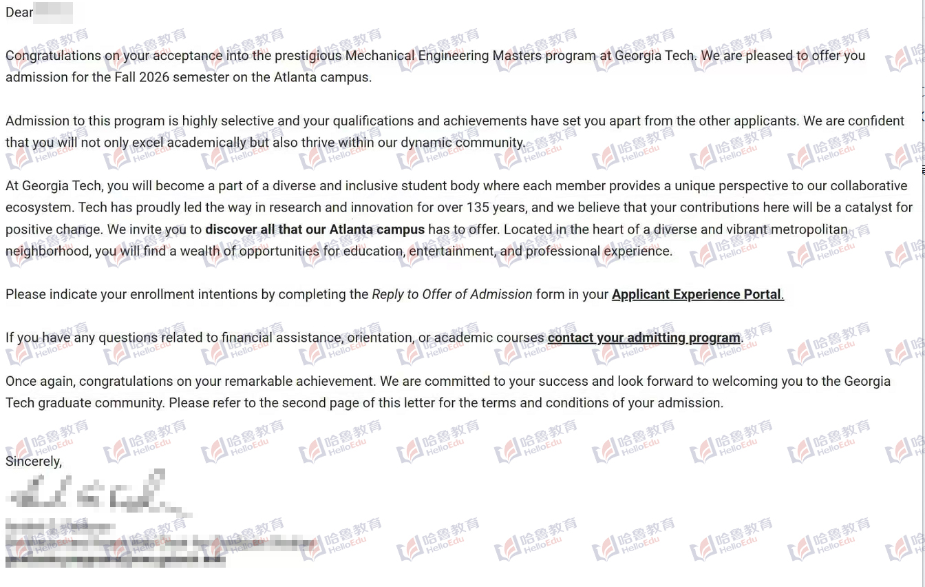 【哈鲁2026录取】佐治亚理工学院机械工程硕士offer到!