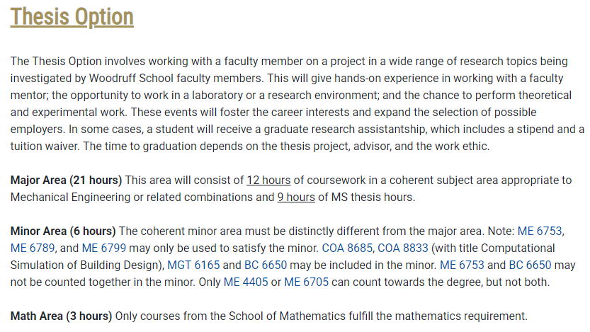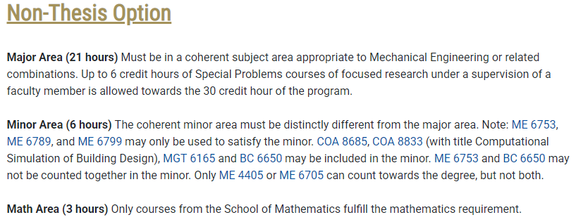 机械工程理学硕士学位(MSME)的最低课程学分要求为 30 学分。其中,4000 级课程最多只能计 6 个学分,其余学分必须为 6000 级或更高级别。在整合专业和辅修专业中所学的所有课程都必须来自计算机学院、科学学院和/或工程学院。辅修课程不会出现在成绩单或学位证明中。攻读硕士学位的候选人必须获得并保持至少 3.0 的研究生平均绩点。以下是非论文和论文选项的要求。