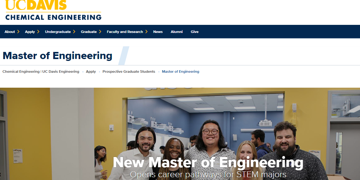 早在2025年12月,加州大学戴维斯分校便官宣在26fall增设一门全新的专业——化学工程硕士(Master of Engineering in Chemical Engineering),全日制项目时长9-12个月,专为STEM领域学生设计!但目前,该项目已截止26fall申请,感兴趣的同学,可以考虑下一个申请季哦!下面,我们一起来简单了解该项目的一些信息~