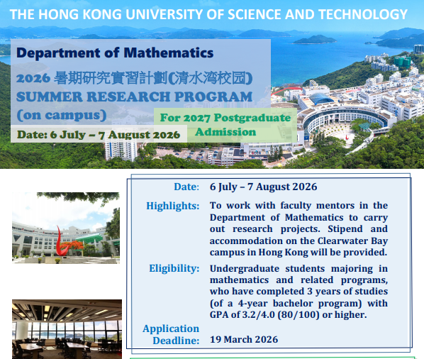 项目诚邀优秀的数学及相关专业大三本科生,参加香港科技大学数学系举办的为期5周的2026暑期研究实习计划。在暑期实习期间表现优异的同学,若满足香港科技大学的英语成绩要求,将有机会提前录取为数学系博士或硕士研究生。