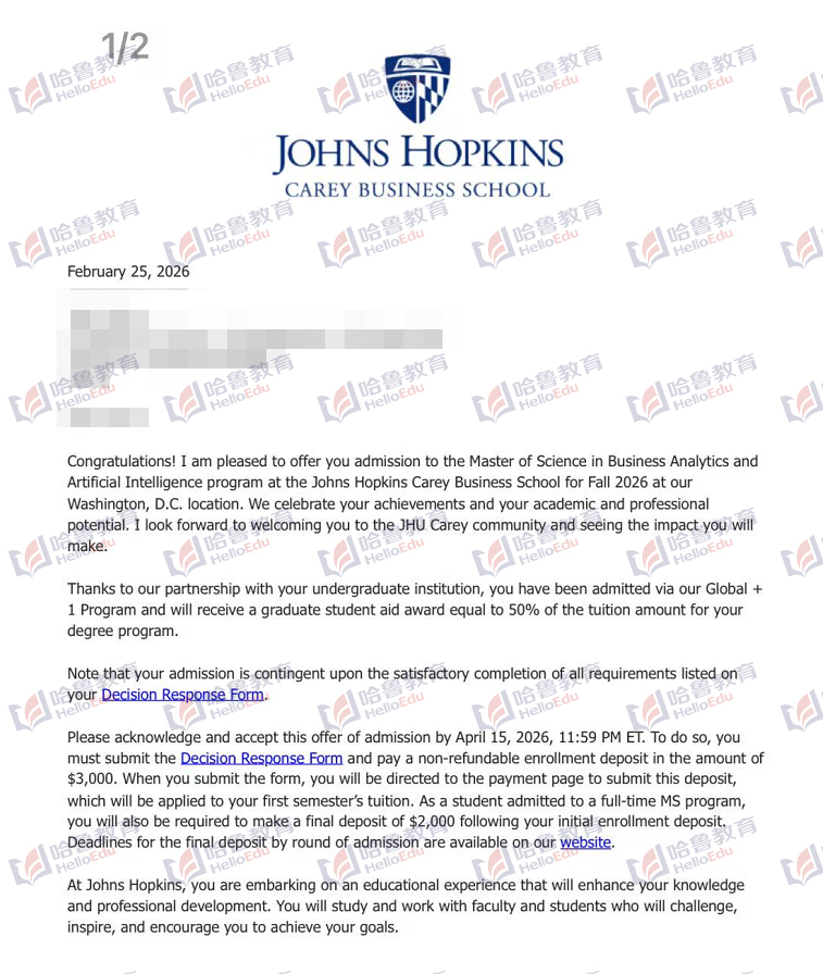 【哈鲁2026录取】约翰霍普金斯大学商业分析与人工智能硕士offer到!
