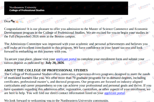 【哈鲁2026录取】GPA2.9+获美国东北大学商业与经济发展硕士offer!