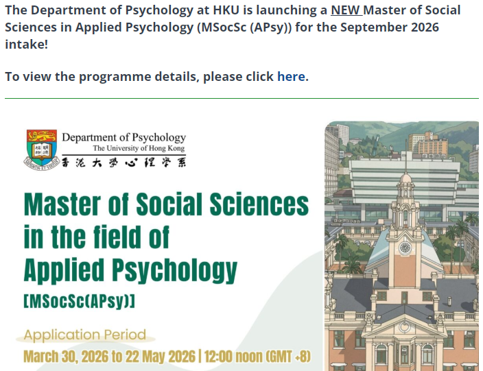 同学们请注意!近日,香港大学官宣其社会科学学院心理学系讲在26fall推出全新专业——应用心理学硕士(Master of Social Sciences in the field of Applied Psychology),并将于3月30日开放申请!感兴趣的同学,赶紧冲啊!!!