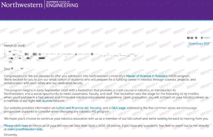 【哈鲁2026录取】GPA3.2+获美国西北大学机器人学硕士offer!