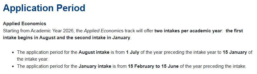 应用经济学硕士(Master of Economics (Applied Economics))是NUS经济学硕士专业设立的方向之一,自2026学年起该方向专业每年提供两次招生,分别是1月入学和8月入学。