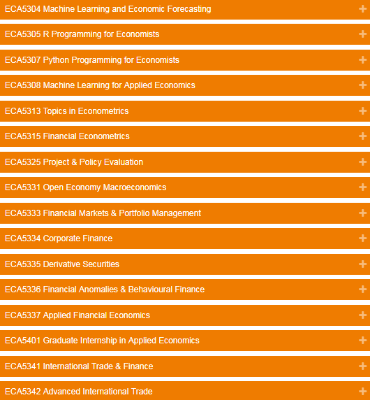 该专业方向是为希望成为专业经济学家或经济顾问,或希望为政府机构工作的学生。它是为那些希望将经济学应用于企业、政策制定者和其他利益相关者所面临的各种挑战的学生而设计的。该项目以应用为导向,要求学生学习核心理论课程和各个领域的课程,如金融经济学、经济数据分析、行为经济学、经济政策和国际经济学。