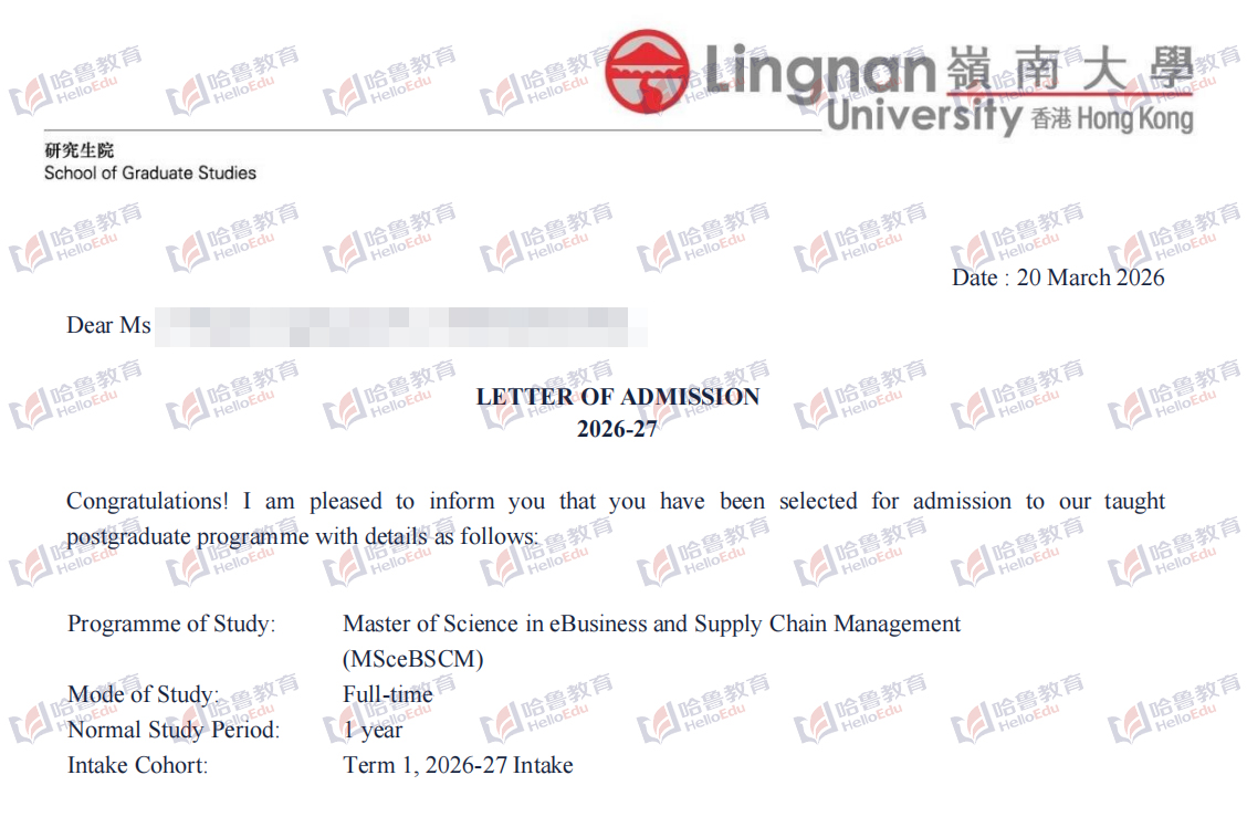 【哈鲁2026录取】GPA2.7+获香港岭南大学电子商务与供应链管理硕士offer!